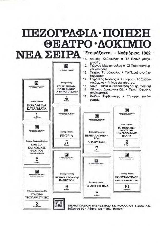 «Πεζογραφία-Ποίηση-Θέατρο-Δοκίμιο-Νέα σειρά. Ετοιμάζονται-Νοέμβριος 1982. Βιβλιοπωλείον της Εστίας Ι.Δ. Κολλάρου & Σιας Α.Ε.», Χάρτης, τχ. 3 (Νοέμβριος 1982), σ. 320