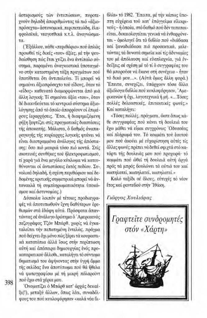 Χουλιάρας Γιώργος, «Στίγματα. Ο Οδυσσέας και το πλήρωμά του», Χάρτης, τχ. 4 (Ιανουάριος 1983), σ. 397-398