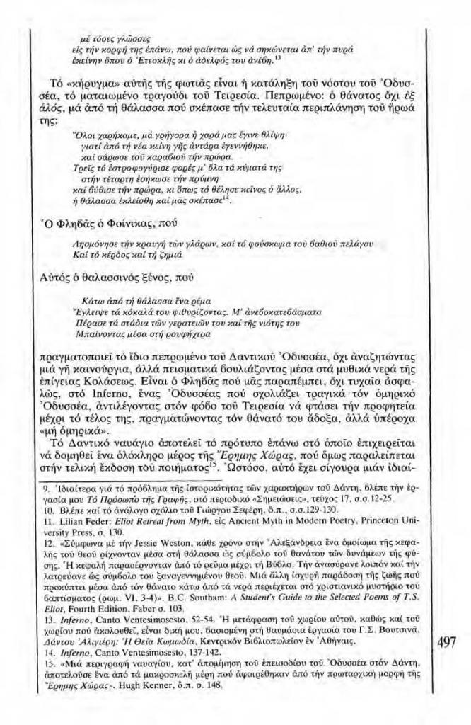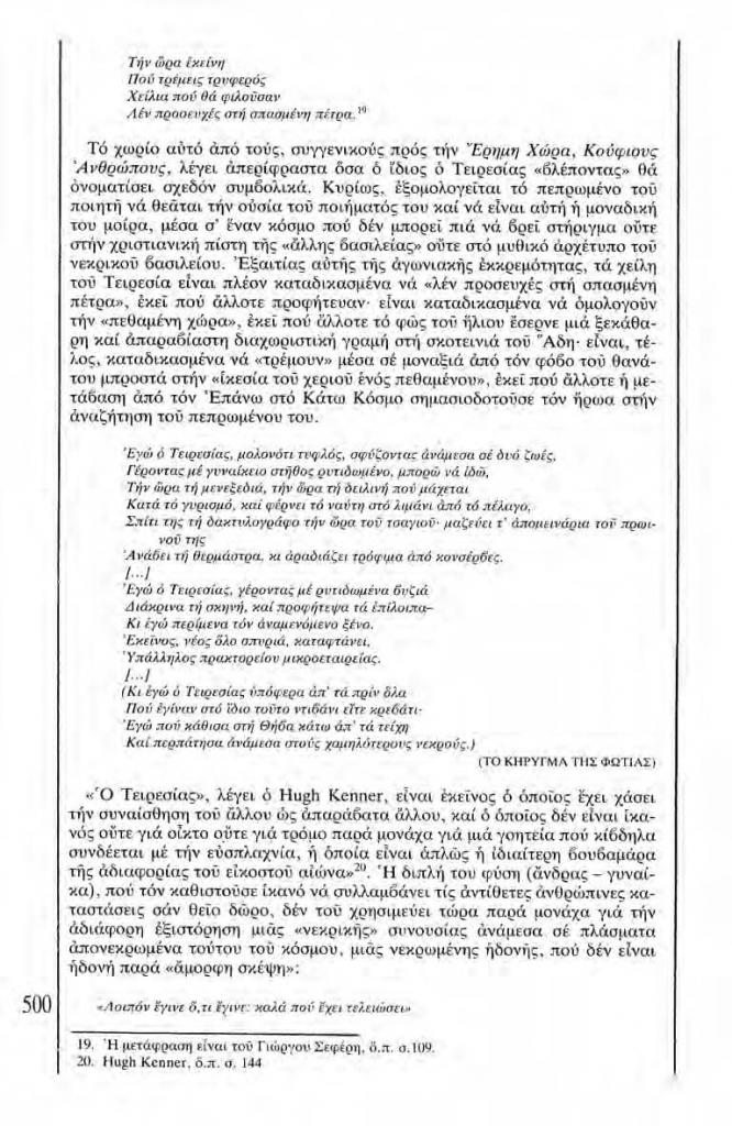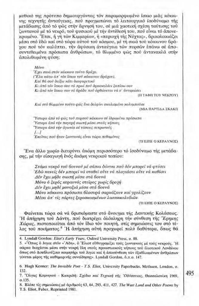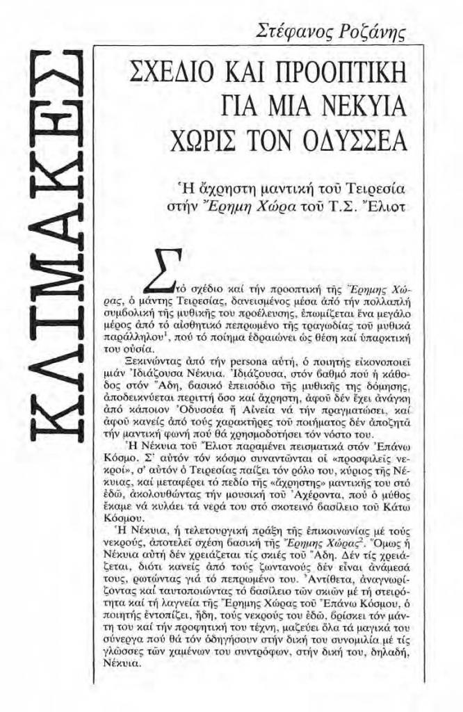, «Κλίμακες. Σχέδιο και προοπτική για μια Νέκυια χωρίς τον Οδυσσέα. Η άχρηστη μαντική του Τειρεσία στην Έρημη Χώρα του Τ.Σ. Έλιοτ», Χάρτης, τχ. 4 (Ιανουάριος 1983), σ. 490-491, 493, 495-501