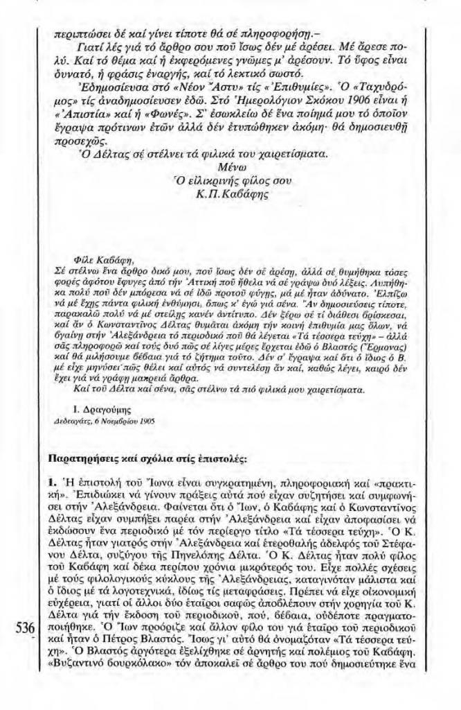 Ιωάννου Γιώργος, «Κείμενα. Δύο επιστολές του Κ.Π. Καβάφη προς τον Ίωνα Δραγούμη και ένα σημείωμά του προς τον Φίλιππο Δραγούμη», Χάρτης, τχ. 5-6 (Απρίλιος 1983), σ. 534-536, 538-540, 542, 544