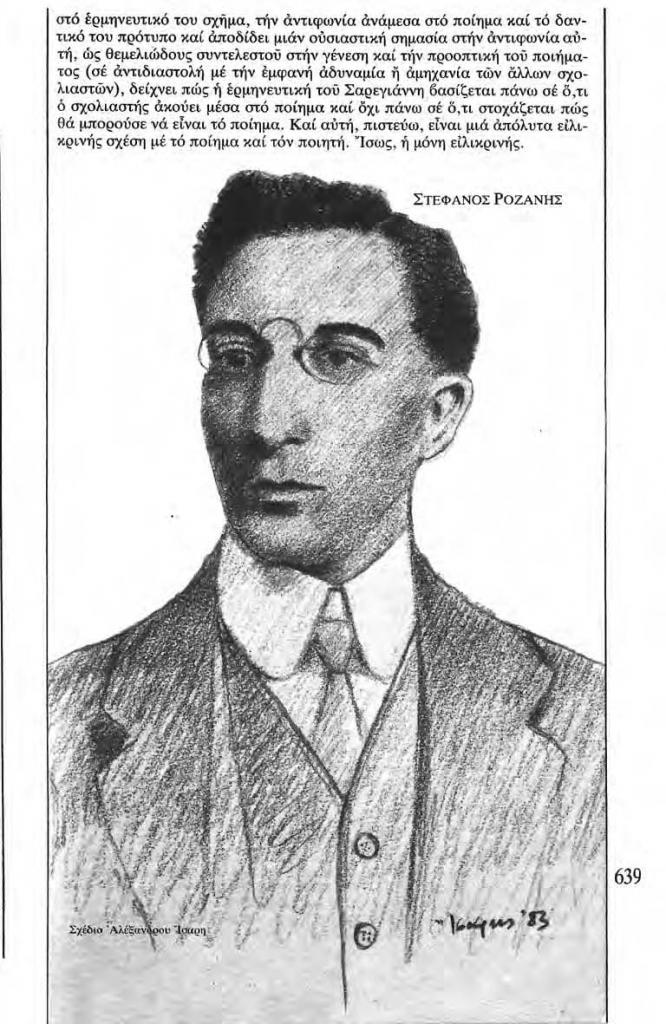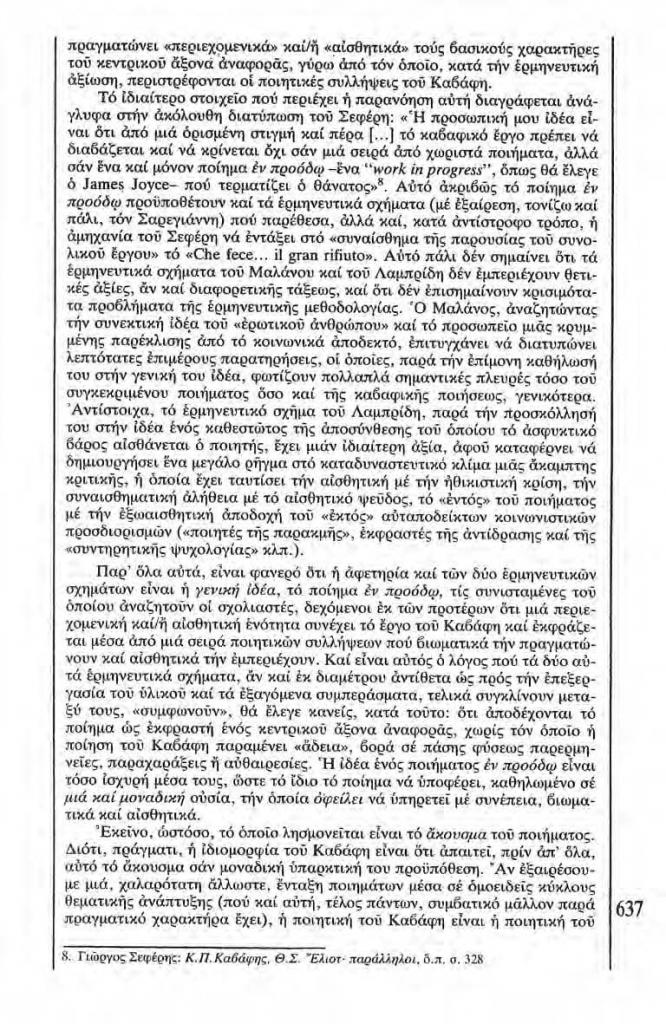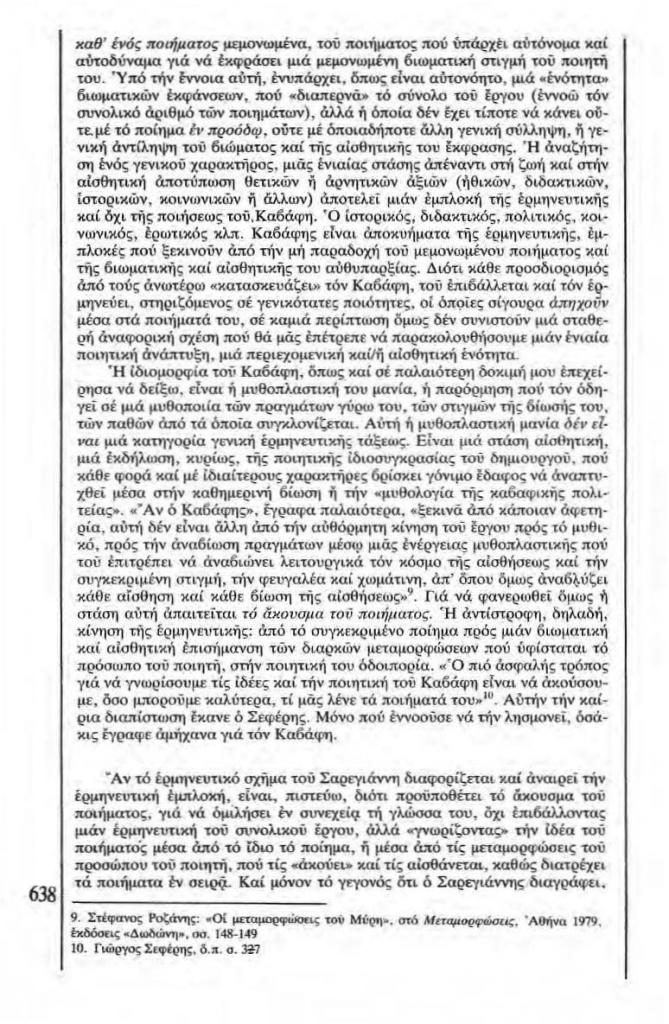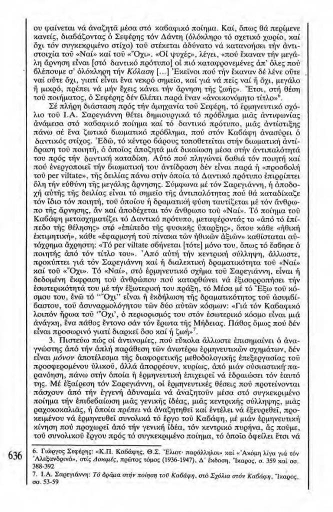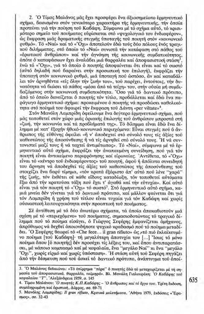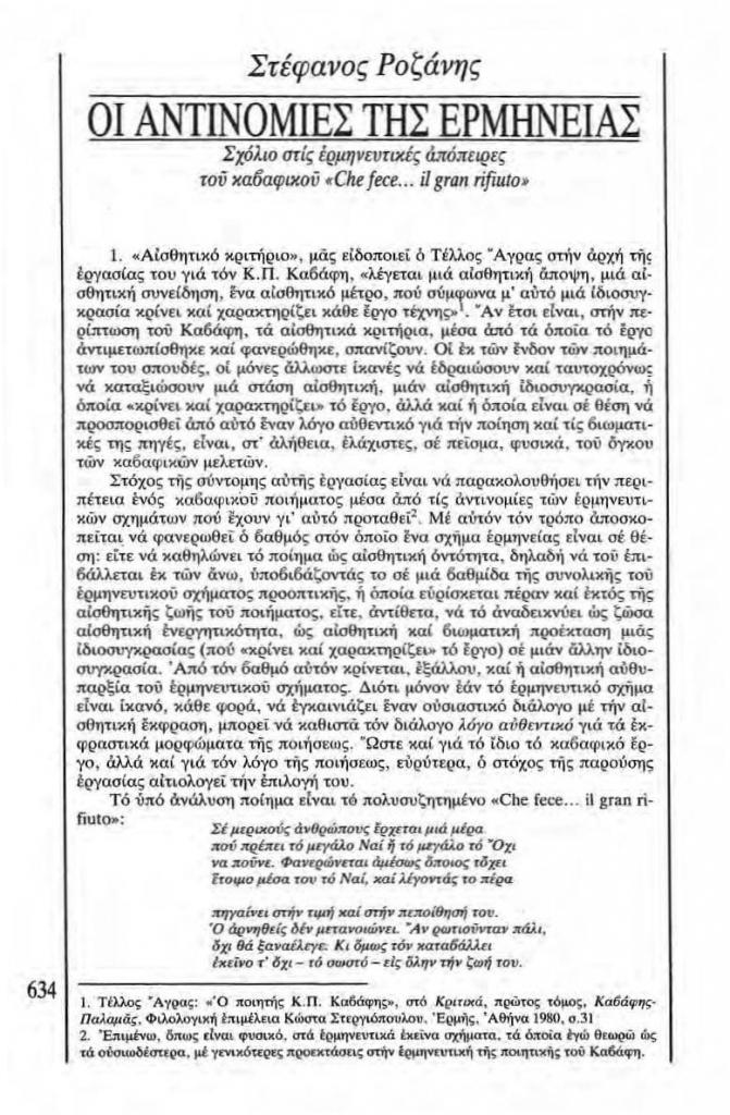, «Κλίμακες. Οι αντινομίες της ερμηνείας: Σχόλιο στις ερμηνευτικές απόπειρες του καβαφικού Che fece… il gran rifiuto», Χάρτης, τχ. 5-6 (Απρίλιος 1983), σ. 634-639