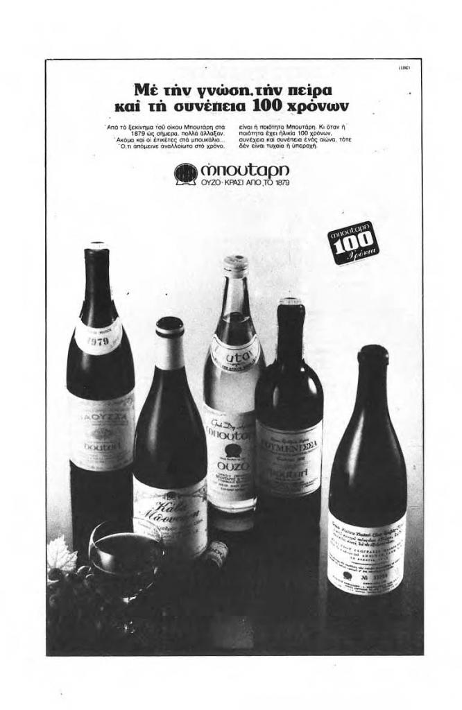 «Με την γνώση, την πείρα και τη συνέπεια 100 χρόνων. Μπουτάρη Ούζο-Κρασί από το 1879», Χάρτης, τχ. 5-6 (Απρίλιος 1983), σ. 747