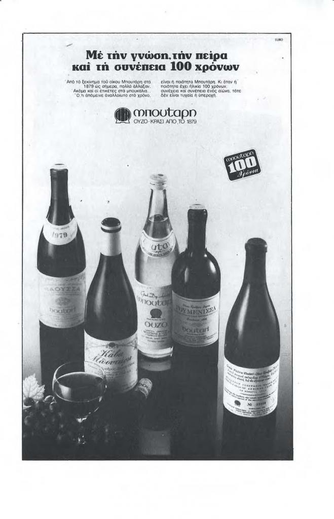 «Με την γνώση, την πείρα και τη συνέπεια 100 χρόνων. Μπουτάρη Ούζο-Κρασί από το 1879», Χάρτης, τχ. 8 (Οκτώβριος 1983), σ. 131