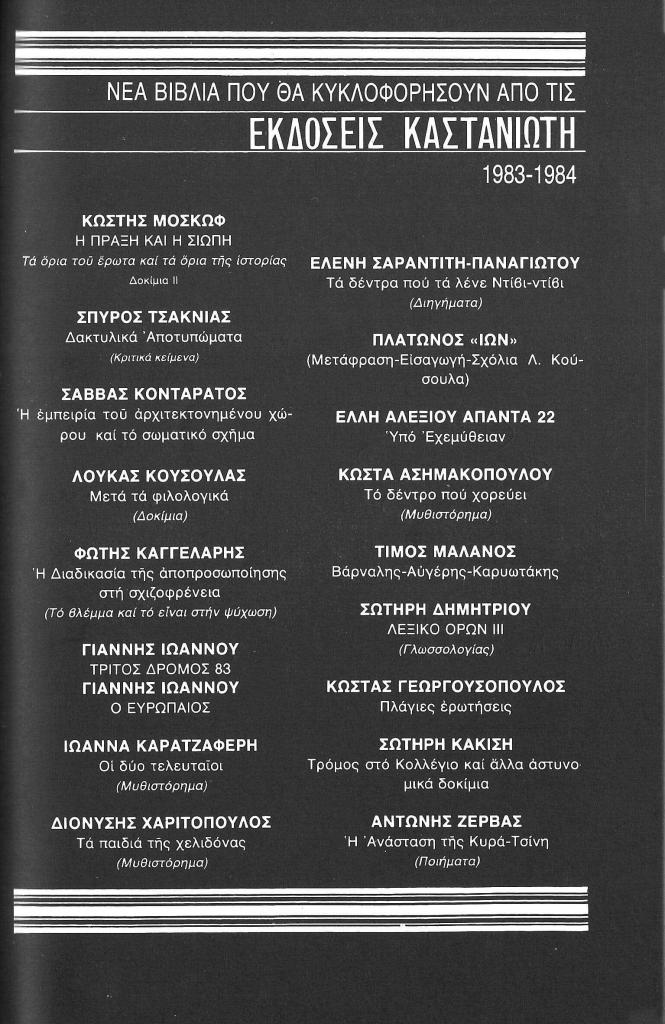«Νέα βιβλία που θα κυκλοφορήσουν από τις Εκδόσεις Καστανιώτη 1983-1984»,