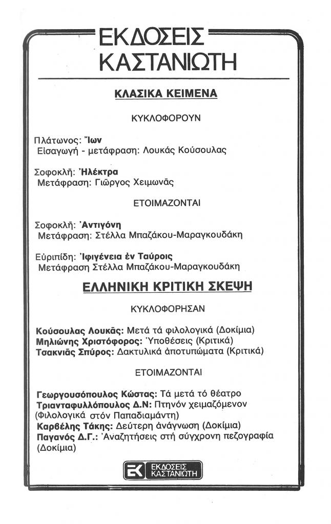 «Εκδόσεις Καστανιώτη. Κλασικά κείμενα-Ελληνική κριτική σκέψη»,