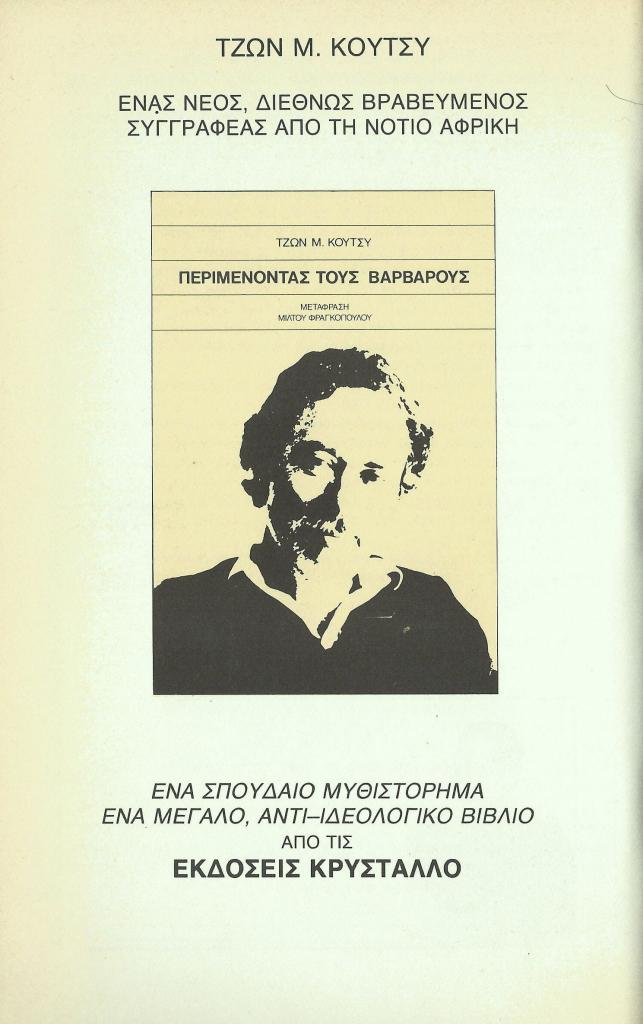 «Τζων Μ. Κούτσυ. Ένας νέος, διεθνώς βραβευμένος συγγραφέας από τη Νότιο Αφρική»,