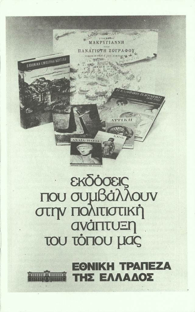 «Εκδόσεις που συμβάλλουν στην πολιτιστική ανάπτυξη του τόπου μας. Εθνική Τράπεζα της Ελλάδος», Χάρτης, τχ. 12 (Σεπτέμβριος 1984), σ. 753