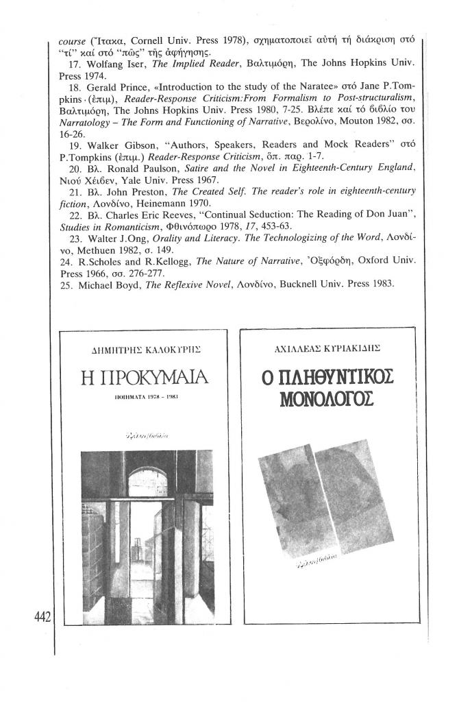 «Δημήτρης Καλοκύρης, Η προκυμαία, Αχιλλέας Κυριακίδης, Ο πληθυντικός μονόλογος. », Χάρτης, τχ. 16 (Ιούλιος 1985), σ. 442