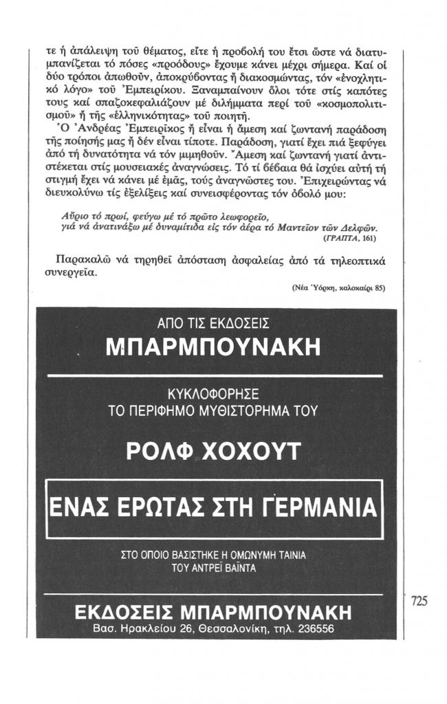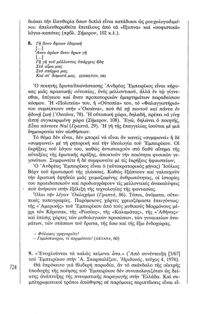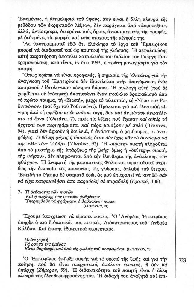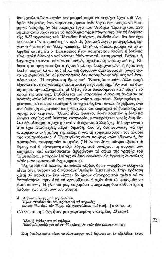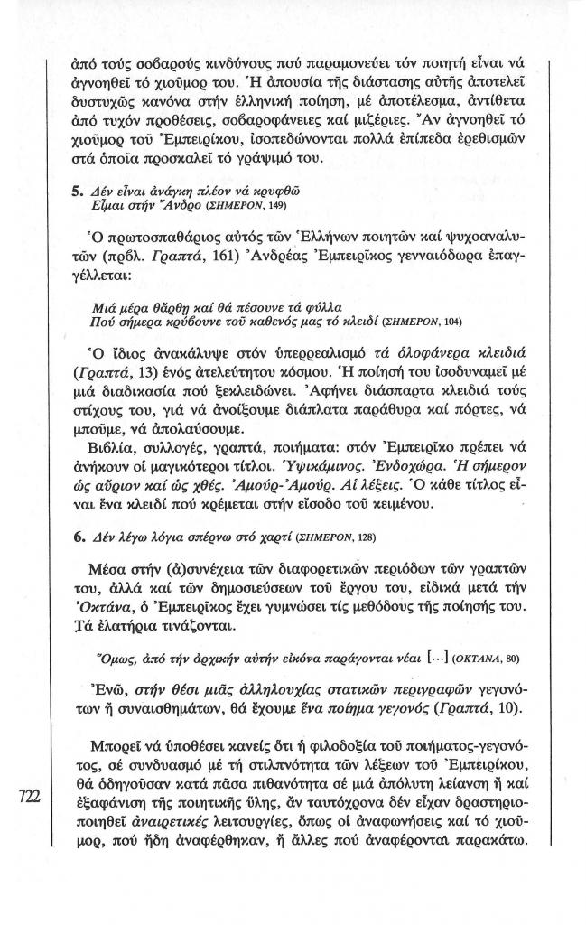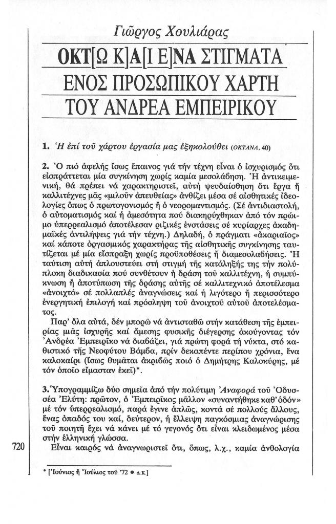 Χουλιάρας Γιώργος, «Οκτ[ώ κ]α[ι έ]να στίγματα ενός προσωπικού χάρτη του Ανδρέα Εμπειρίκου», Χάρτης, τχ. 17-18 (Νοέμβριος 1985), σ. 720-725