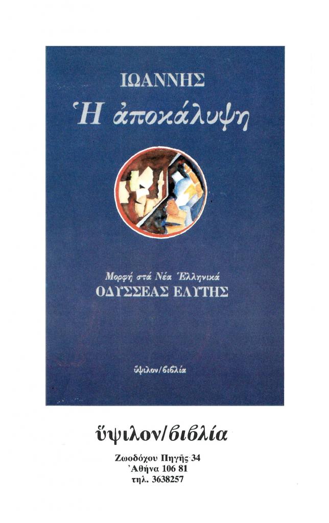 «Ιωάννης, Η αποκάλυψη. Μορφή στα νέα ελληνικά Οδυσσέας Ελύτης», Χάρτης, τχ. 19 (Φεβρουάριος 1986), σ. (έσω οπισθόφυλλο)