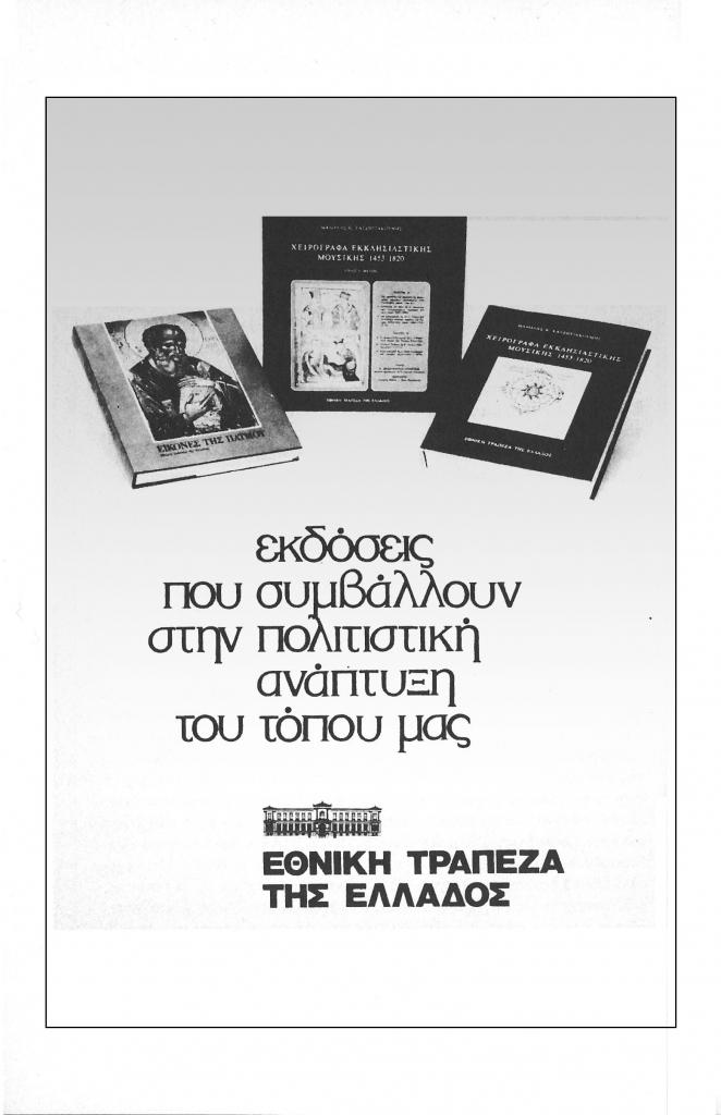 «Εκδόσεις που συμβάλλουν στην πολιτιστική ανάπτυξη του τόπου μας. Εθνική Τράπεζα της Ελλάδος», Χάρτης, τχ. 20 (Ιούλιος 1986), σ. 226