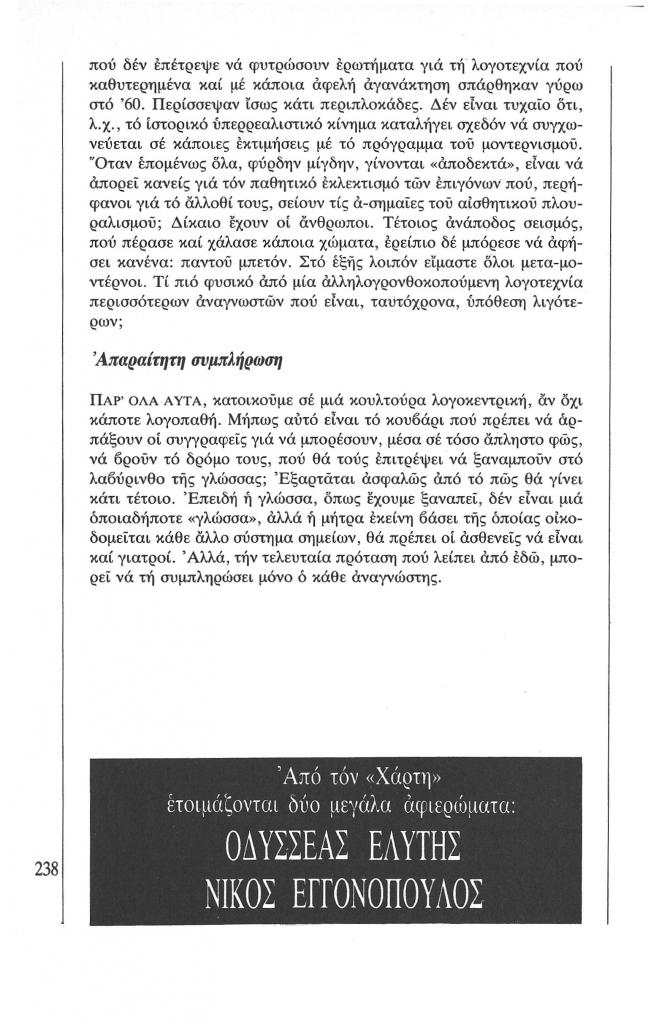 «Από τον Χάρτη ετοιμάζονται δύο μεγάλα αφιερώματα: Οδυσσέας Ελύτης – Νίκος Εγγονόπουλος», Χάρτης, τχ. 20 (Ιούλιος 1986), σ. 238