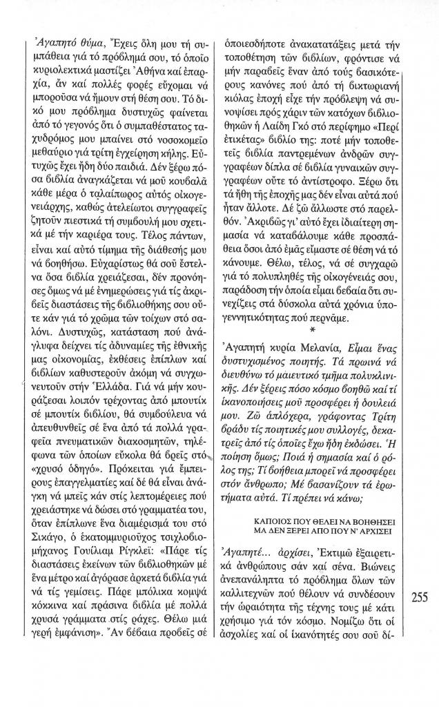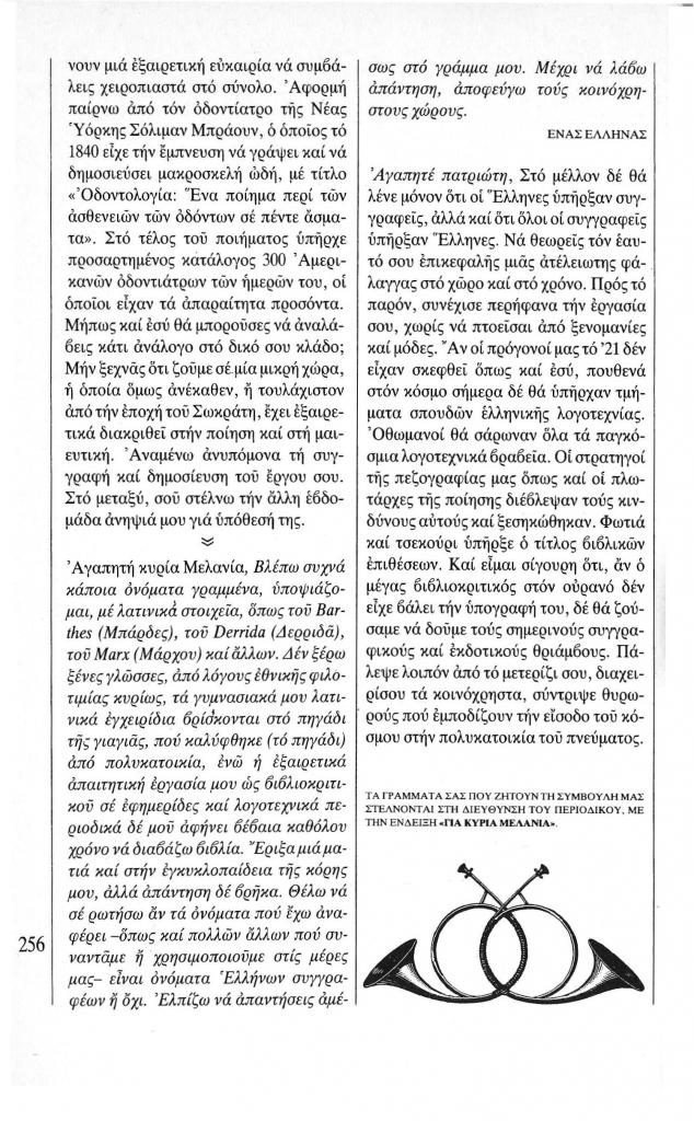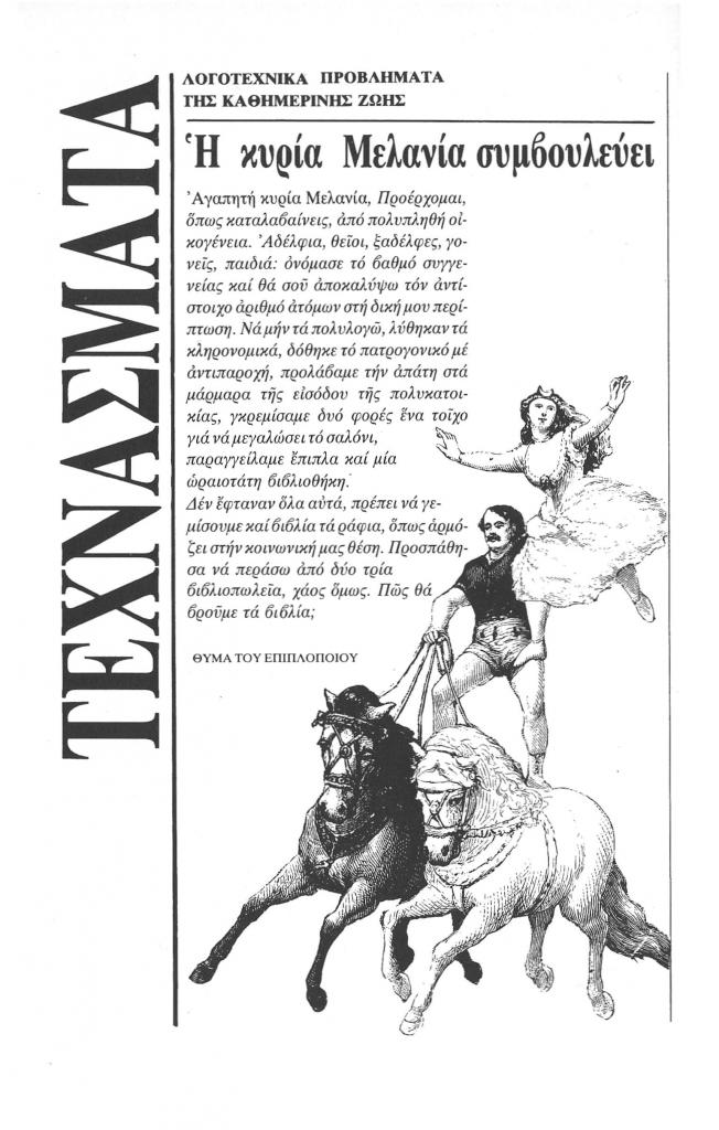 (ανυπόγραφο), «Τεχνάσματα. Λογοτεχνικά προβλήματα της καθημερινής ζωής: Η κυρία Μελανία συμβουλεύει», Χάρτης, τχ. 20 (Ιούλιος 1986), σ. 254-256